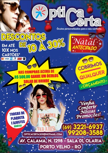 A Optica Certa está com uma super promoção neste mês de dezembro para você dá um toque no seu visual ou presentear aquela pessoa especial com um óculos personalizado. Venha conferir o Natal antecipado e as facilidades de pagamento da Optica Certa.