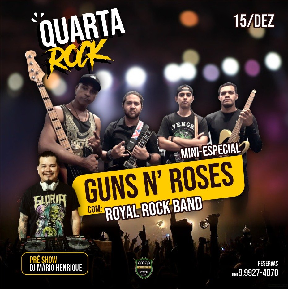Na edição desta quarta-feira, dia 15, terá apresentação do Dj Mário Henrique, na sequência, além dos clássicos do rock, a Royal Rock Band fará um mini-especial Guns N'Roses.