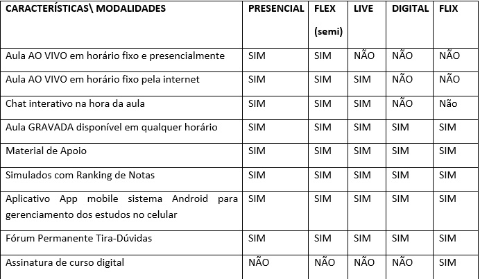Temos cursos para esse concurso nas modalidades PRESENCIAL, FLEX, LIVE, DIGITAL e FLIX. Veja a diferença entre as modalidades: