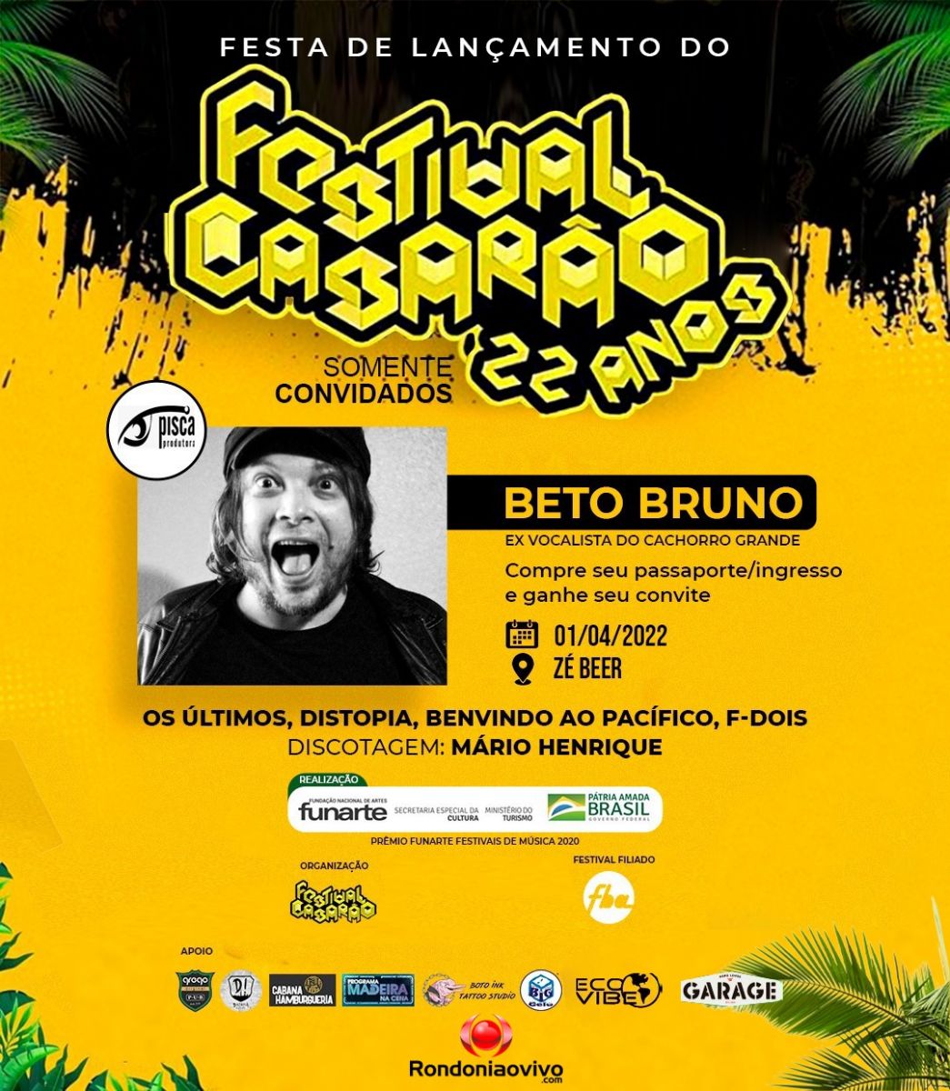 A festa de lançamento para o retorno do "Festival Casarão" acontecerá dia 01 de abril às 18h, no Zé Beer em Porto Velho (RO). Na próxima sexta-feira, quem promete animar a noite é o artista Beto Bruno, ex-vocalista da banda Cachorro Grande.