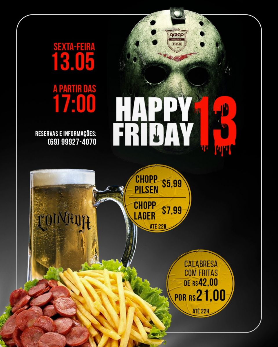 Tire aquelas peças pretas de dentro do guarda-roupa, e monte aquele look black para curtir essa sexta-feira 13, no evento músical "Happy Friday 13", do tradicional Pub porto-velhense o Grego Original, com os shows das bandas Hey Joe's e Old Blend.