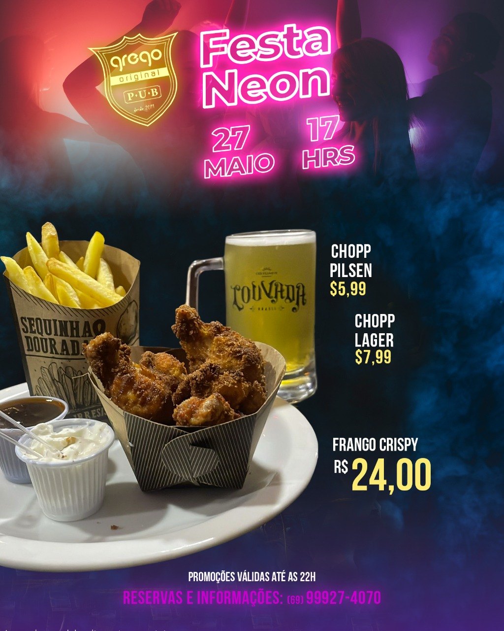 "Já preparou o seu look?", perguntou Luna Lorena, sócia administrativa do premiado e tradicional Pub porto-velhense, o Grego Original, se referindo a "Festa Neon", que acontece nesta sexta-feira, dia 27, a partir das 17h, no evento músical "Happy Friday" da casa.