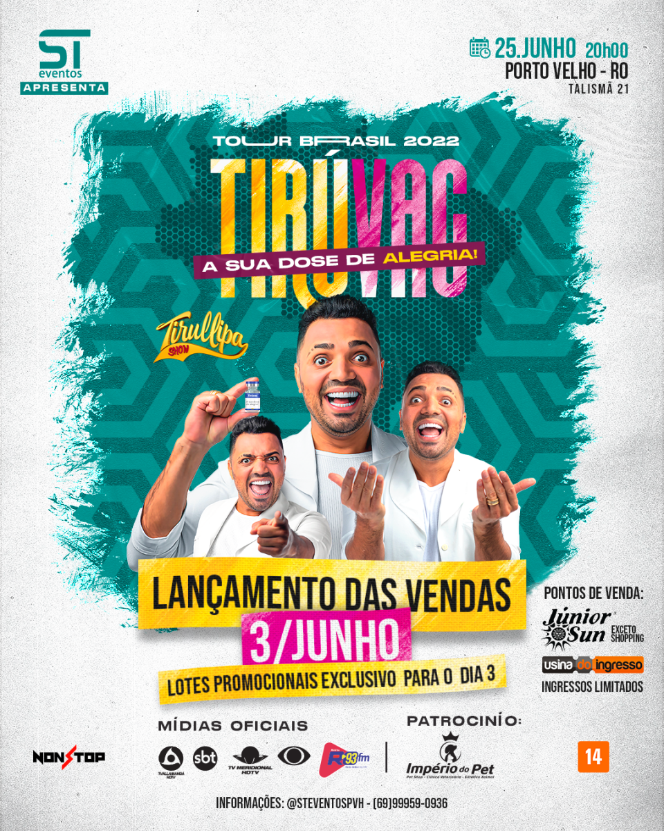 O maior show de HUMOR do Brasil. Tirullipa e seu novo show TIRUVAC, que ainda vai contar com a participação de alguns participantes da TIRUHOUSE. A formatação do evento será completamente diferente dos eventos de PRACHE que são realizados na casa de Shows Talismã 21. Será um evento 100% com cadeiras confortáveis, ambiente climatizado, coberto e arejado.