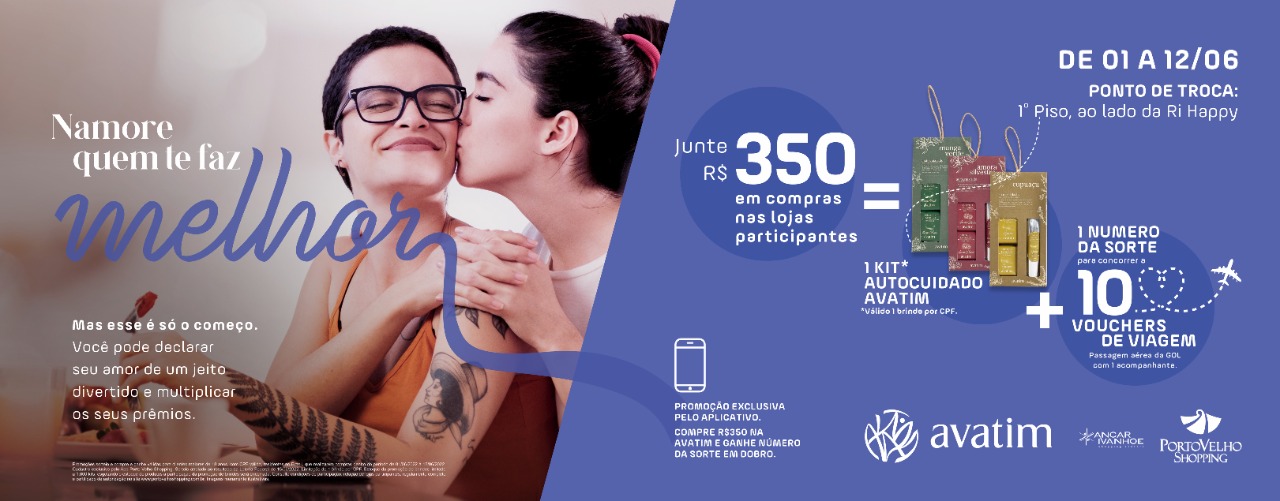O Dia dos Namorados está chegando e o Porto Velho Shopping lançou a campanha “Namore Quem Te Faz Melhor”. Até o dia 12 de junho, os clientes podem juntar até R$350 em compras no empreendimento, ganhar um kit Avatim e um número da sorte para concorrer a 10 vales-passagens com acompanhante.