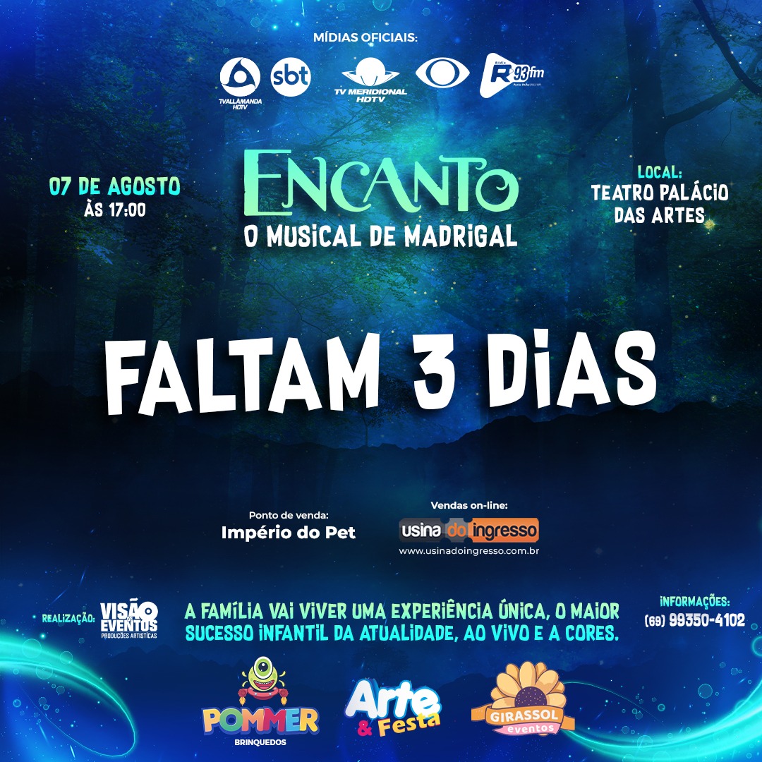 Sucesso nos teatros do Rio de Janeiro e São Paulo, a adaptação livre do maior e mais recente sucesso da Disney, Encanto o Musical dos Madrigal tem única apresentação neste domingo dia 07 às 17:00 no Teatro Palácio das Artes, o espetáculo da Cia Carioca Sufixipa vem do Rio de Janeiro para capital rondoniense, a super produção promete emocionar o público, um espetáculo para toda família.