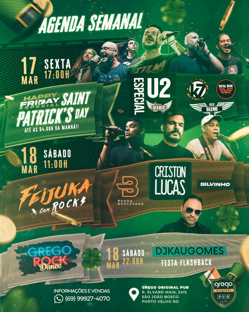 Sexta feira, iniciam-se os trabalhos com o evento Happy Friday especial de Saint Patricks Day, o dia do santo cervejeiro, incluindo várias promoções de chopps, petiscos e balde de Heineken!