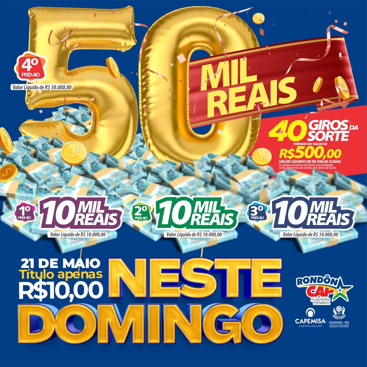 No Rondôncap deste domingo tem 44 prêmios em dinheiro e o título é só 10 reais, ajude as Apaes de Rondônia e deixe a sorte ajudar você, participe!