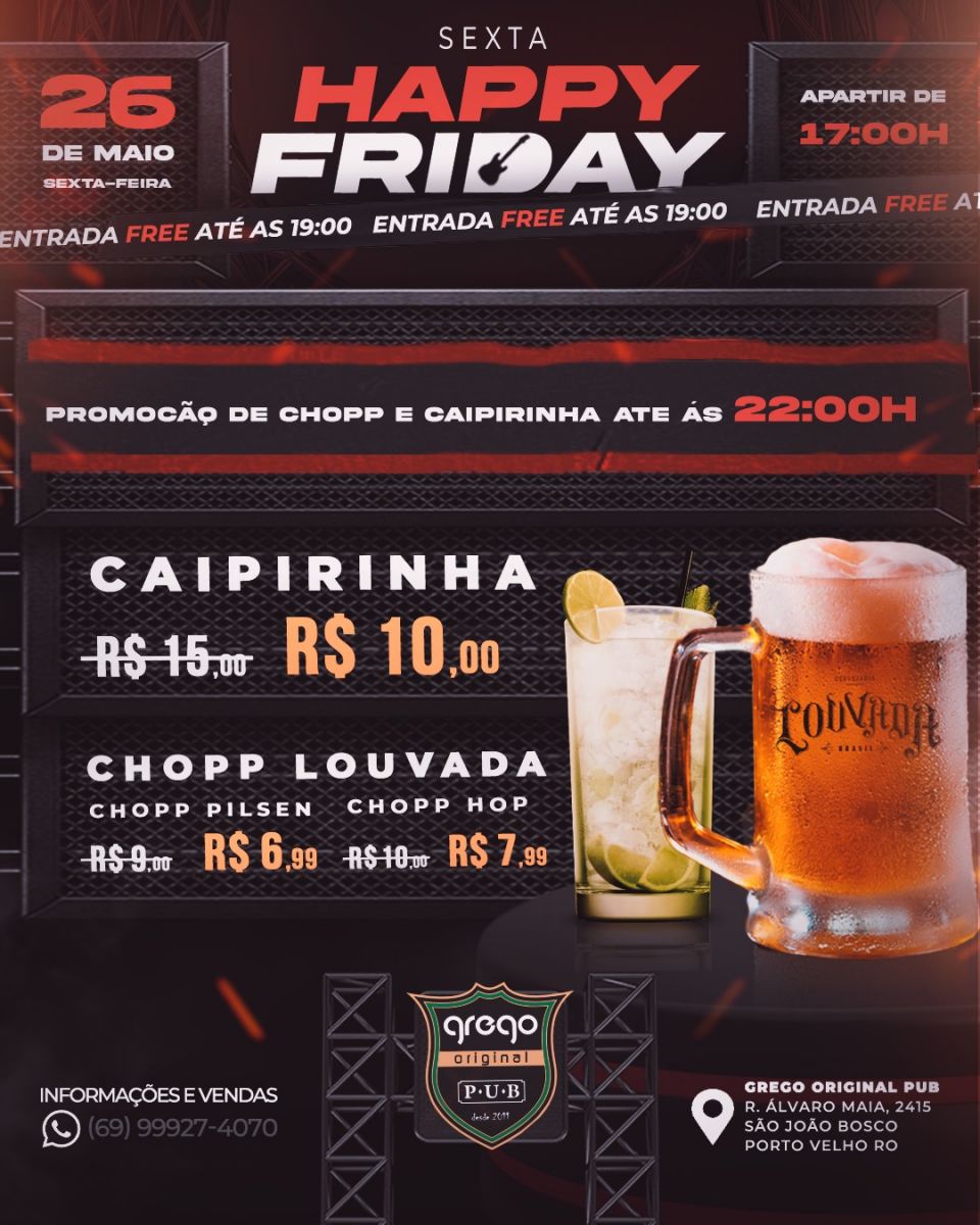 Para você que curte um happy hour na sexta-feira, o lugar certo é o Grego Original Pub. Casa aberta às 17:00, com promoções de chopp, caipirinha, petisco. E para animar a noite, iniciando o som Elkeer Guillen Rock Show, com muito pop rock, nacionais e internacionais. Logo em seguida, no palco principal dando continuidade ao show, banda Old Blend trazendo os melhores e maiores sucessos do rock clássico. Enquanto isso, no espaço Lounge, banda Rádio Hotel trazendo o melhor do dançante para sua noite.