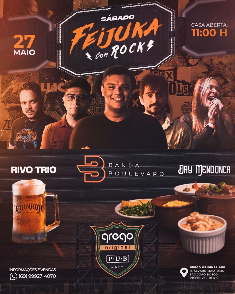 Se você é amante da boa comida e do bom som, o evento feijuka com rock é o seu lugar. Iniciando os trabalhos, banda Rivotrio com clássicos dos anos 80 e 90, logo após banda Boulevard fazendo um som incrível, com os melhores do pop rock. E também no espaço Lounge, Day Mendonça com um sonzinho acústico para você que quer apenas papear a tarde toda.