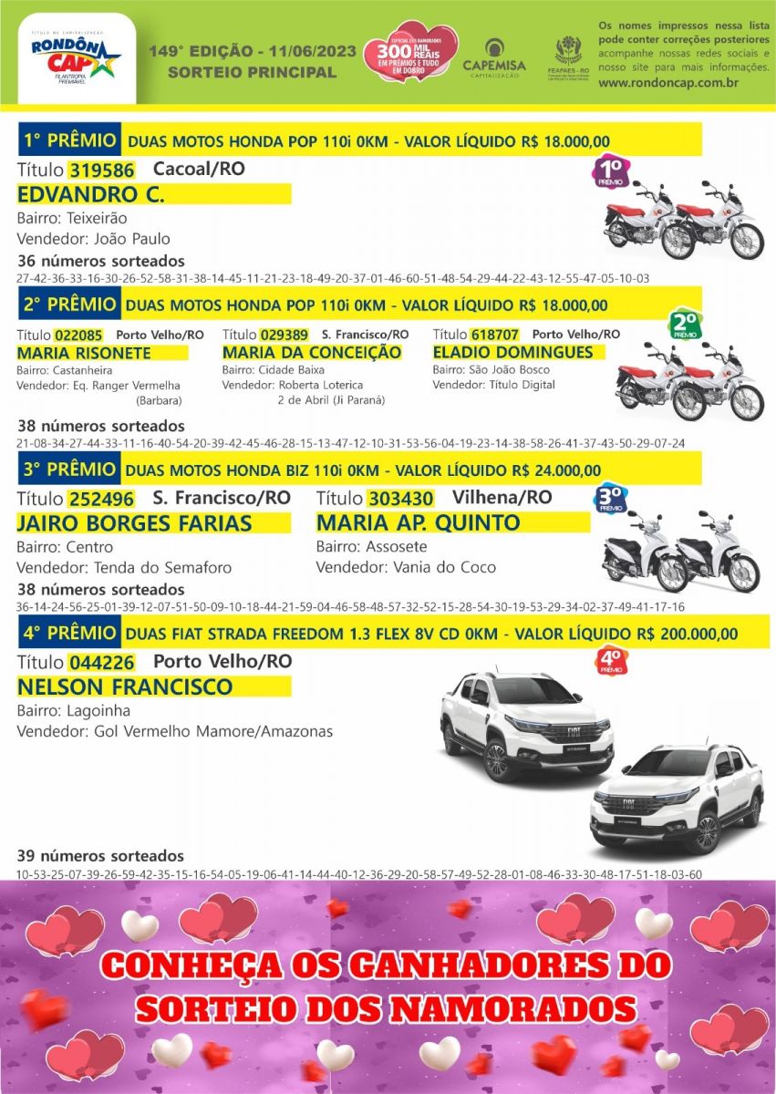 Quem ganhou no sorteio dos namorados você já conhece, mas quem vai ganhar no próximo sorteio pode ser você, no quarto prêmio deste domingo tem um Renault Kwid e uma Biz juntos no valor de 75.000 reais, 3 Tvs gigantes, 40 giros da sorte e o título só 10 reais, ajude as Apaes, participe e boa sorte!