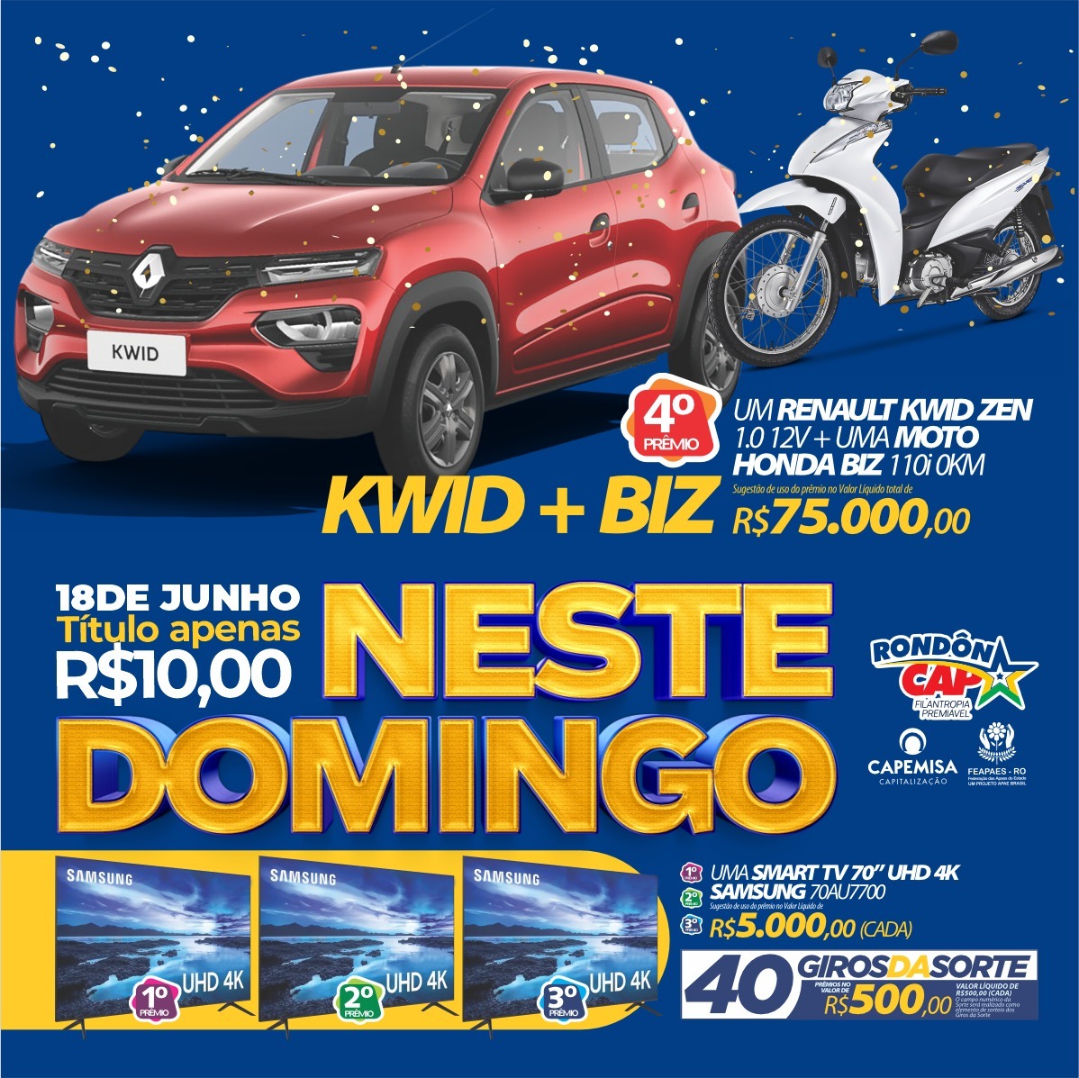 Rondôncap, neste domingo tem Carro e moto, 3 Tvs gigantes, 40 giros da sorte e o título só 10 reais, ajude as Apaes de Rondônia, participe e boa sorte!