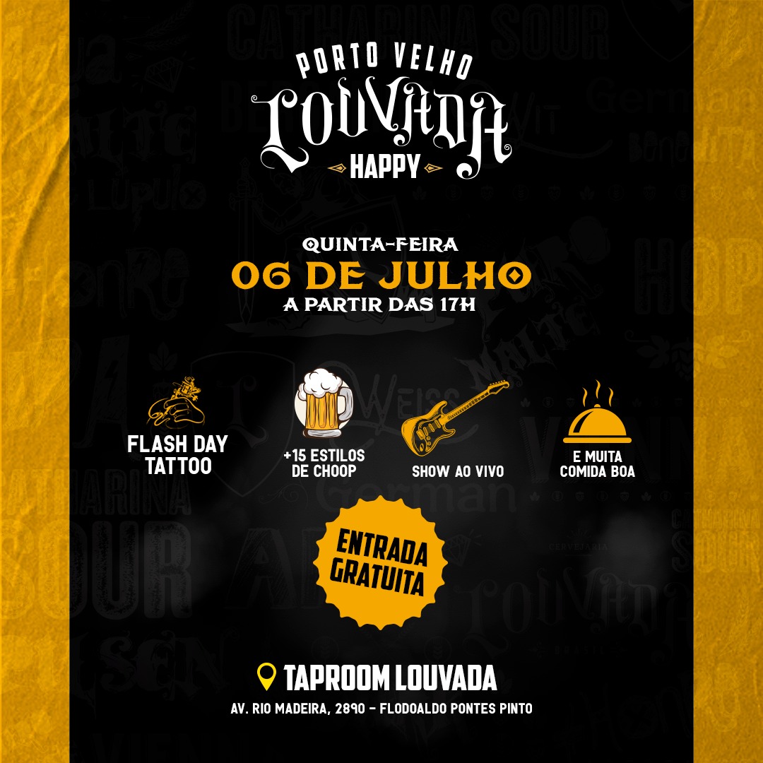 Serviço: - HappyLouvada - Data: 06/07 - Horário: 16h às 23h - Endereço: Av Prefeito Chiquilito Erse, 2890 – Flodoaldo Pontes Pinto - Info: (69)99919-4799
