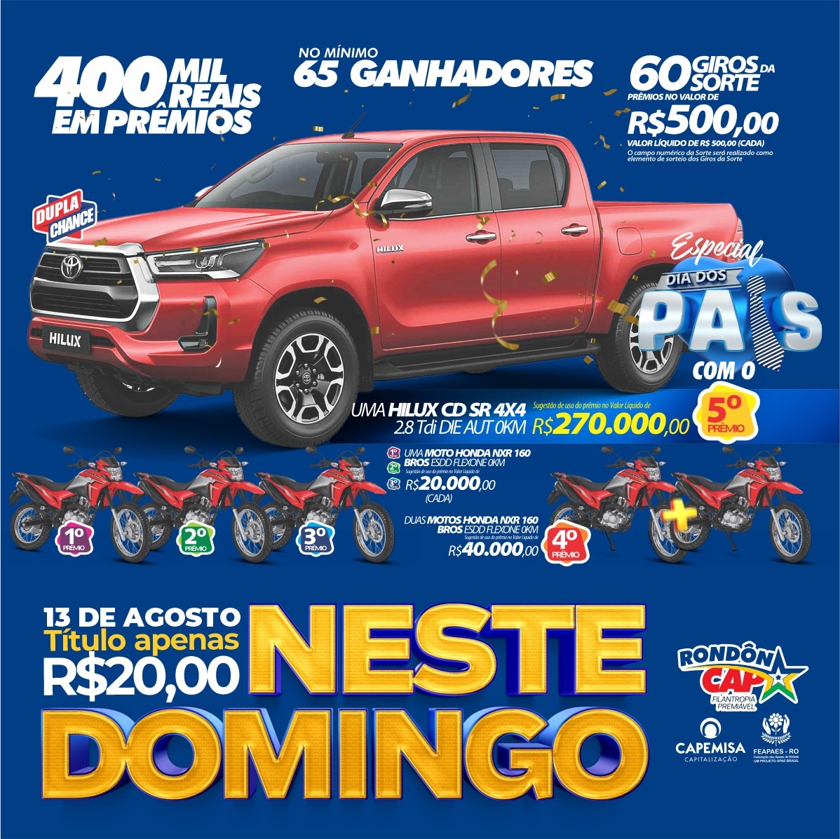 Tem uma Honda Brós no valor de 20.000 reais no primeiro prêmio, outra Honda Brós de 20.000 reais no segundo, mais uma Honda Brós no valor de 20.000 reais no terceiro prêmio, e duas Honda Brós juntinhas no quarto prêmio no valor total de 40.000 reais, e no quinto e principal prêmio tem uma caminhonete Toyota Hilux no valor de 270.000 reais, além é claro dos 60 giros da sorte de 500 reais cada, serão 400.000 reais em prêmios: