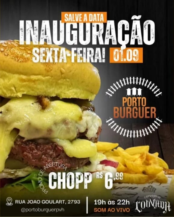 Mais informações podem ser conseguidas no WhatsApp (69) 99256-0303 e o funcionamento é de quinta à terça (folgas às quartas), das 18:30 às 23:30. A Porto Burguer funciona na Rua João Goulart, 2793, Bairro Liberdade, entre a Rua Senador Álvaro Maia e a Avenida Abunã. Então chama, Porto Burguer!