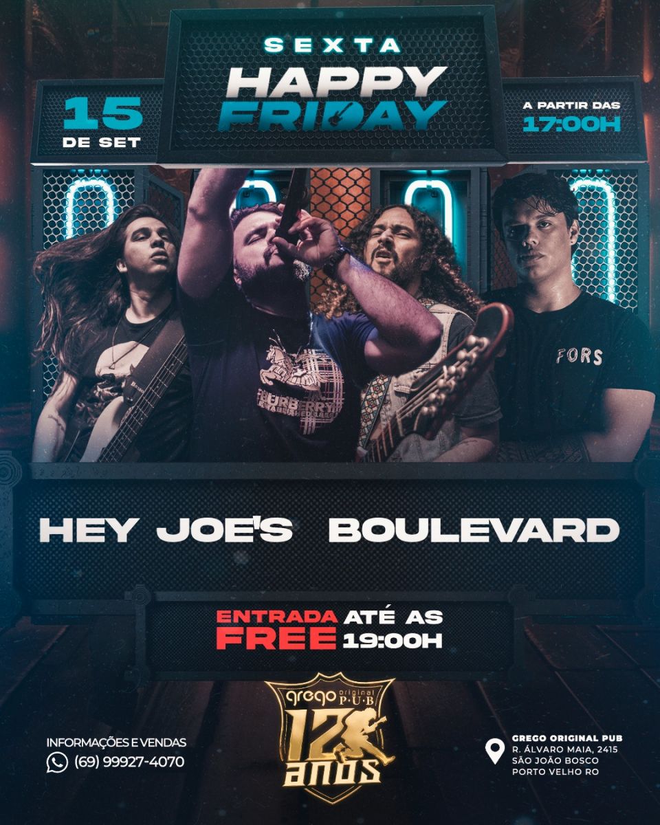 Grego Original. Casa aberta as 17h, com promoções de chopp, caipirinha e petisco, até às 22h. Garantindo a música boa, banda Hey Joe's e Boulevard com uma linha musical voltada para a vertente do pop rock e numetal.