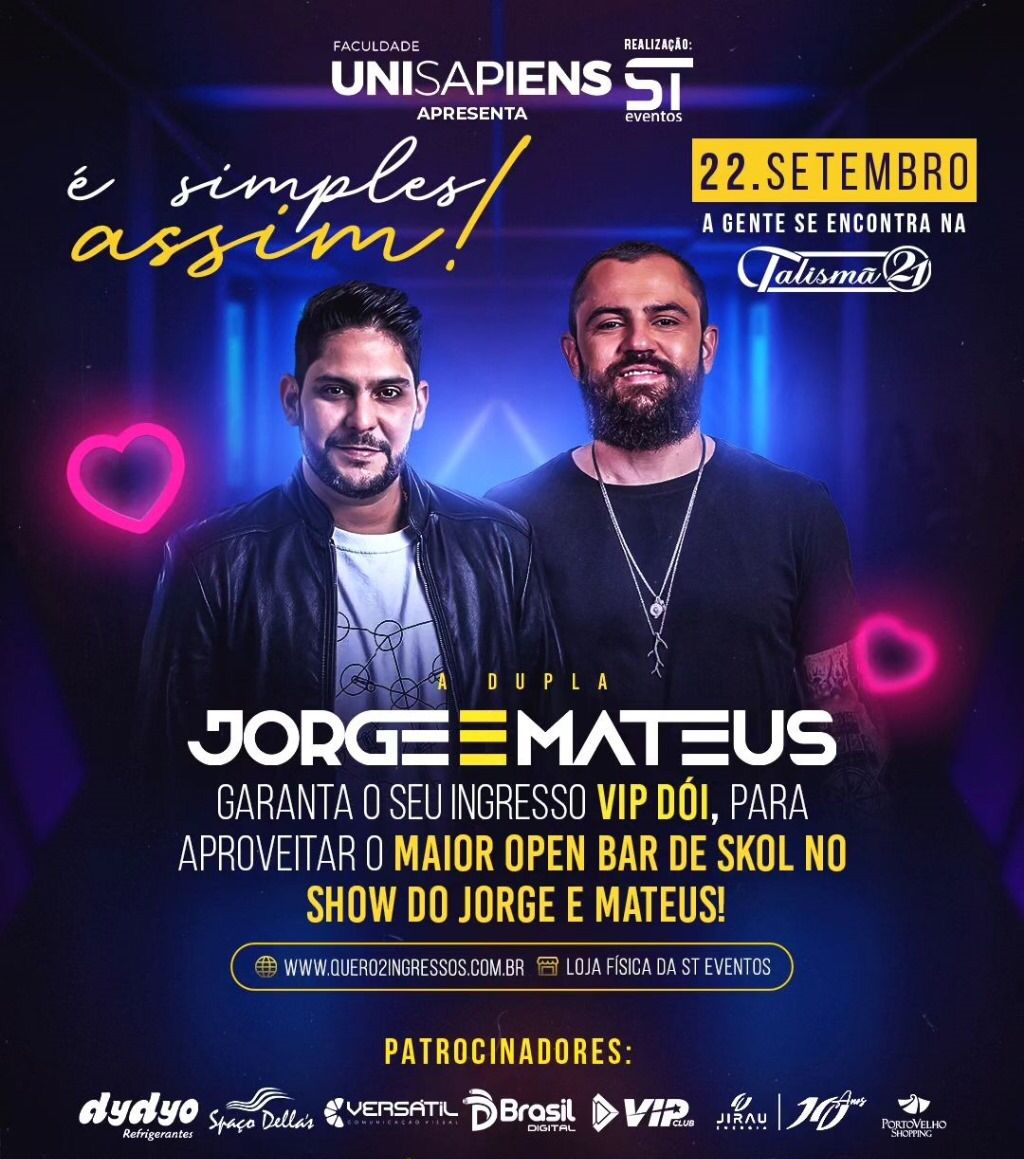 Com assinatura da empresa St Eventos a dupla Jorge e Mateus se apresenta nesta sexta-feira, dia 22, na casa de shows Talismã 21, em Porto Velho.