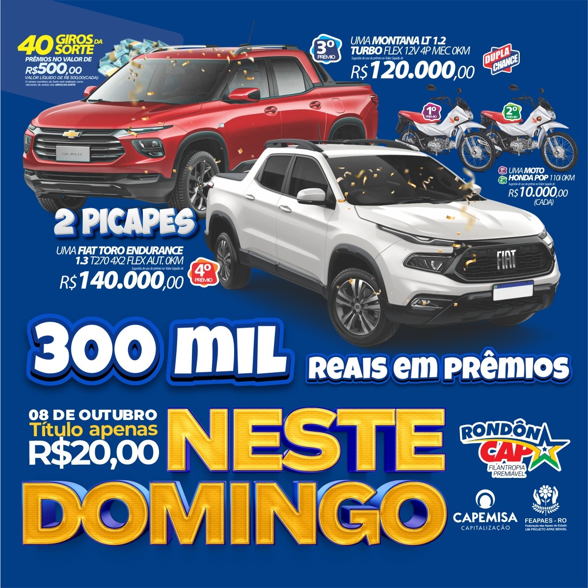 Viu ai? e o próximo pode ser você, Domingo tem Sorteio especial de outrubro com uma Fiat Toro, uma Chevrolt Montana, 2 Honda Pop, 40 giros da sorte e o título é dupla chance por apenas 20 reais, ajude as Apaes de Rondônia, participe e boa sorte!