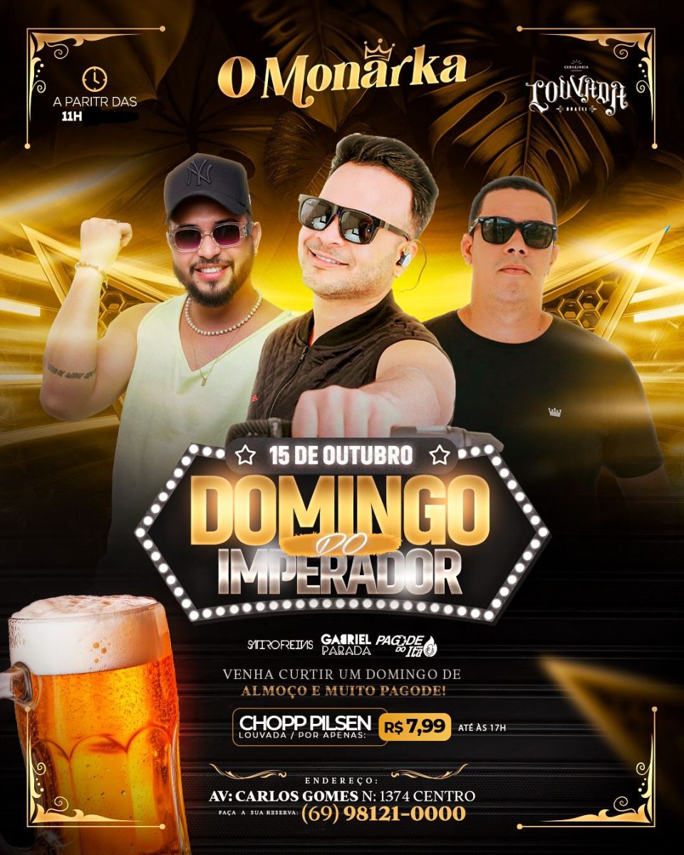 Hoje, a partir das 11h, tem o almoço no quilo, promoções de chopp e três atrações no evento gastronômico e musical "O Domingo do Imperador" da casa que é o novo conceito de entretenimento, lazer e gastronomia da capital rondoniense, O Monarka. "A festa começa às 11h e vai até a noite com show de Gabriel Parada", enfatizou o empresário Sinezio Tapajós.