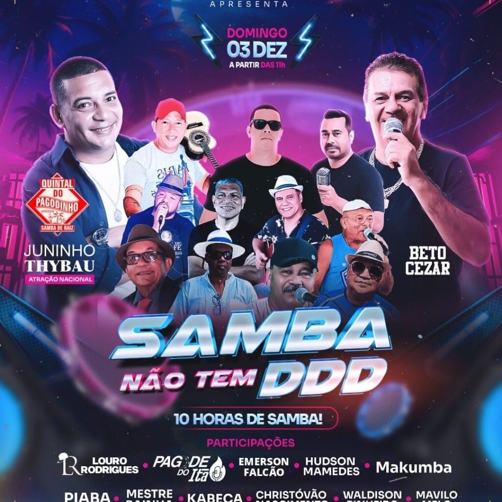 Com previsão de ter 10h de samba, neste domingo, a partir das 11h, o palco da casa de shows, O Monarka, recebe o evento músical o "Samba Não Tem DDD", com atração nacional, Juninho Thybau, primo do Zeca Pagodinho, e partições de diversos consagrados grupos de pagode e samba da região.