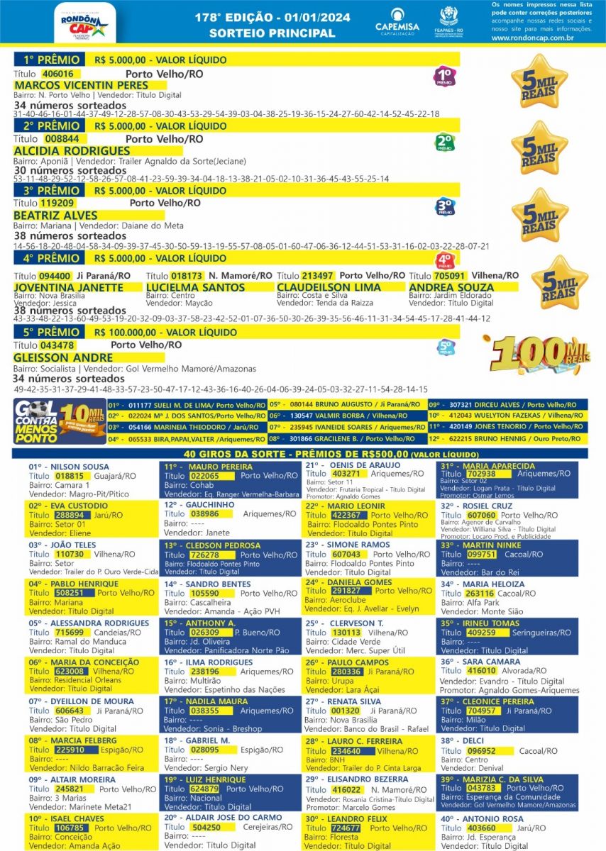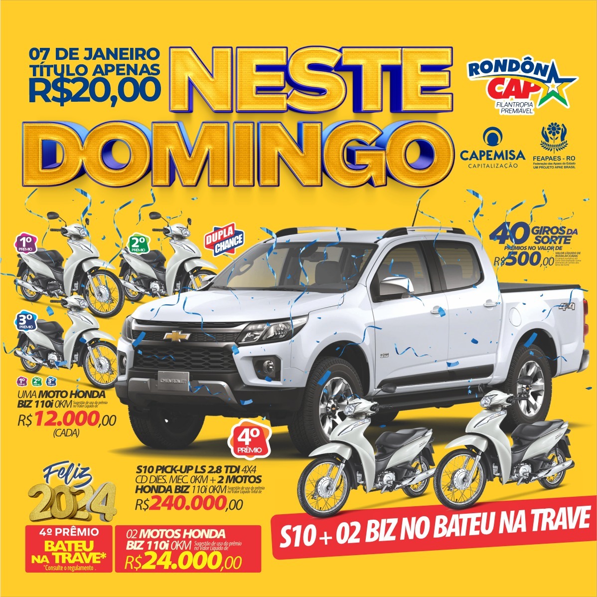Viu aí? Esses foram os primeiros sortudos do Rondôncap em 2024 e o próximo pode ser você, neste domingo tem sorteio especial de ano novo com uma S10 de 240.000 reais no quarto prêmio e mais 2 Honda Biz no Bateu na trave, para aqueles que ficarem por apenas 1 número para ganhar. E ainda tem mais 3 Honda Biz e 40 giros da sorte, sele seu título ajude as Apaes, participe e boa sorte!