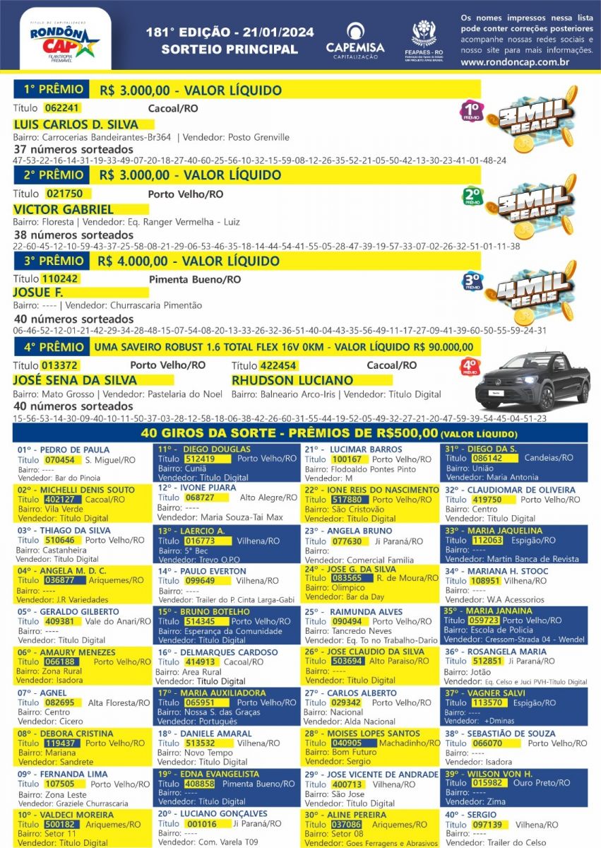 Quem ganha no Rondôncap você vê Aqui na nosso site, vamos conhecer os sortudos dos prêmios principais do sorteio do dia 21 de Janeiro