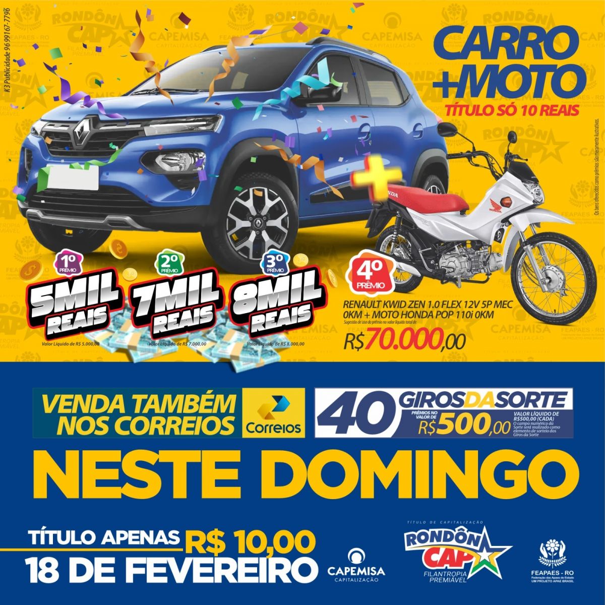 No quarto prêmio deste domingo o Rondôncap vai sortear um Renault Kwid mais uma Honda Pop juntinhos no valor total de 70.000 reais, é carro e moto na garagem, ou dinheiro na conta!