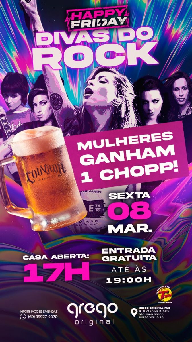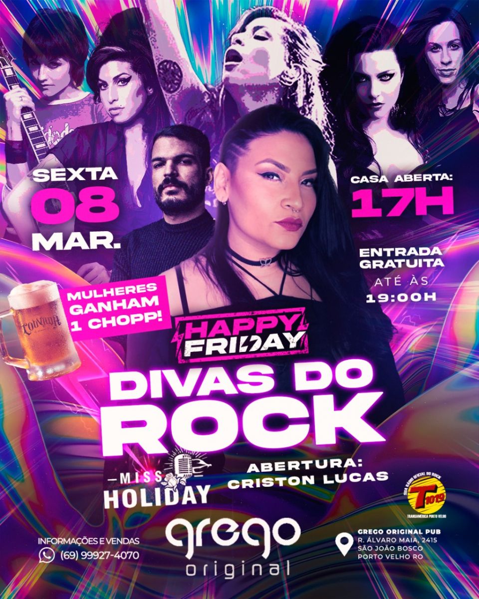 Sexta feira, Dia internacional da mulher, a partir das 17h, casa aberta para um sextou especial! De atrações musicais, Criston Lucas iniciando os trabalhos, logo após, banda Miss Holiday com especial Divas do Rock, e para as mulheres que comparecerem, um chopp será por nossa conta.
