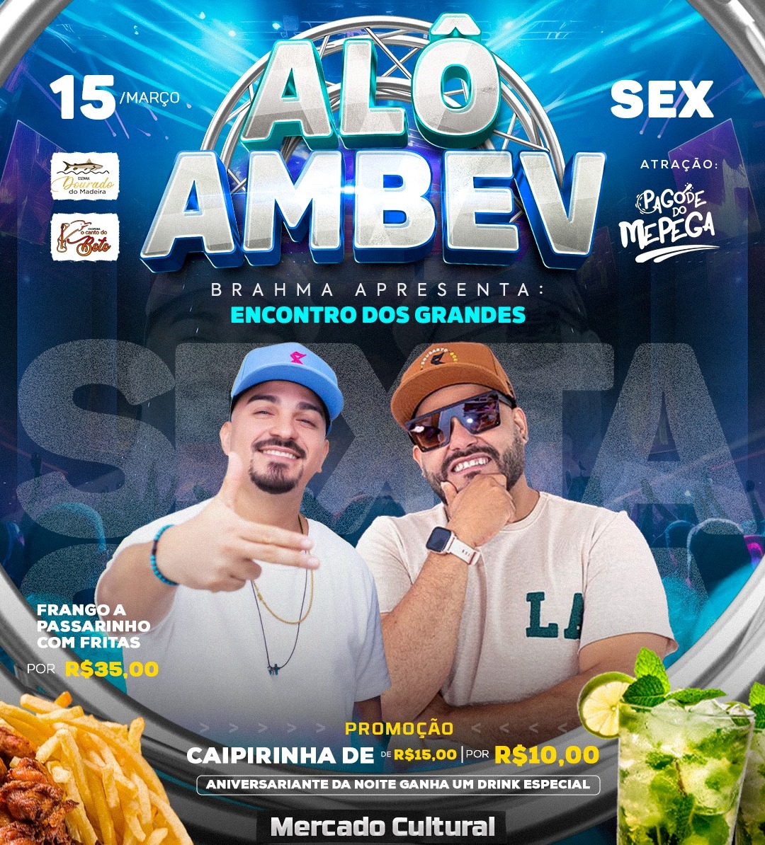 "Sextou... E hoje, a partir das 20h, teremos o evento músical 'Alô AmBev, a Festa!', com showzaço do grupo Pagode Me Pega", e você e sua família são os nossos convidados", disse o empresário Sinezio Tapajós permissionário do box Dourado do Madeira, ao divulgar agenda músical e gastronômico que vão acontecer neste final de semana no Mercado Cultural de Pvh.
