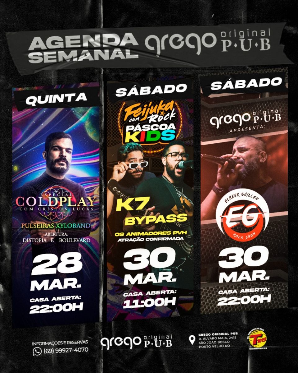 Os sábados são mais divertidos por aqui! Se você gosta curtir uma tarde agitada, com boa música e uma gastronomia diferenciada, precisa conhecer a feijuka com rock do grego original. Nesse sábado, o comando do show fica por conta das bandas Bypass e K7. No espaço lounge, com a presença do coelinho da páscoa e a turma Os animadores, vai ter muita diversão e chocolate.