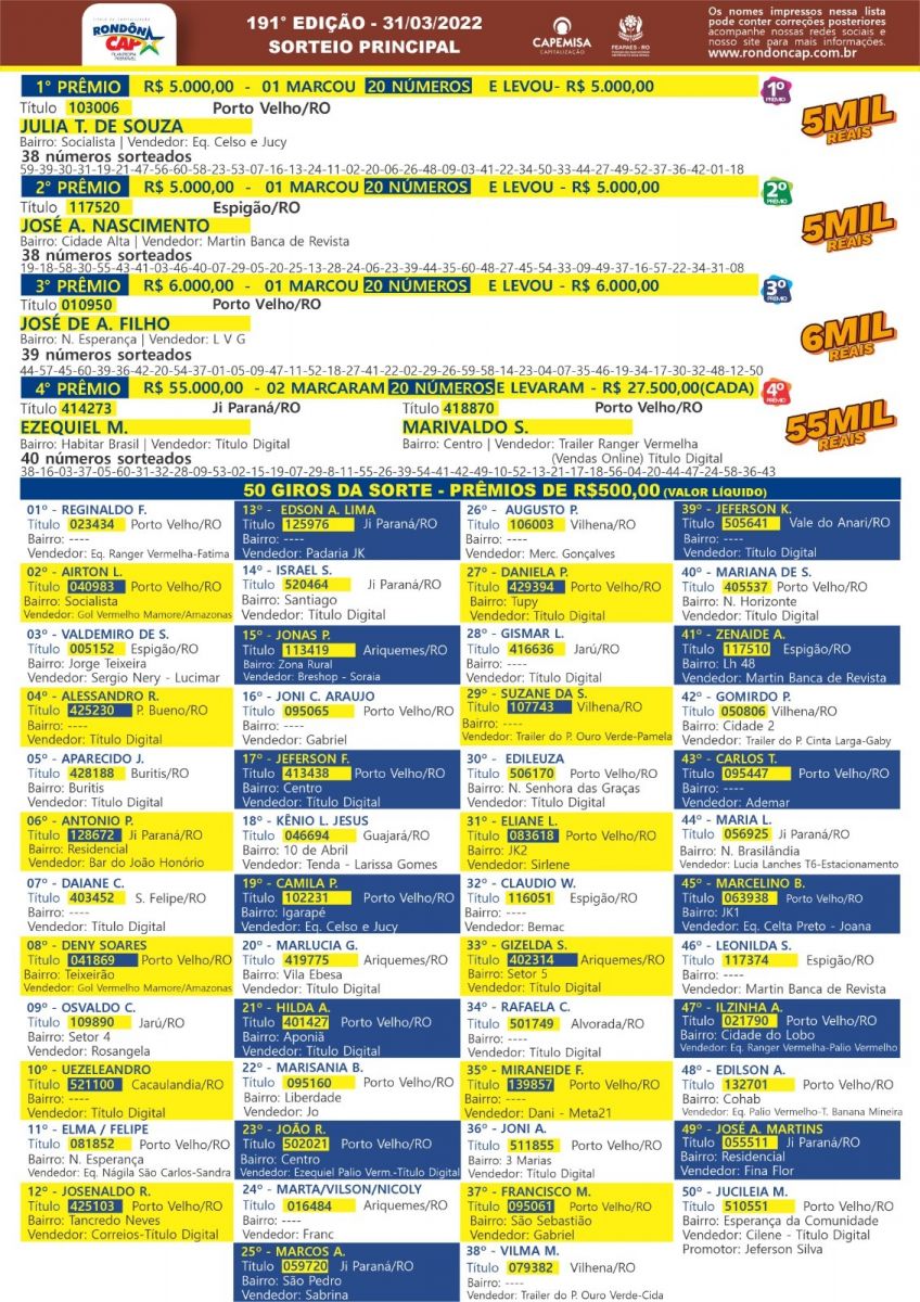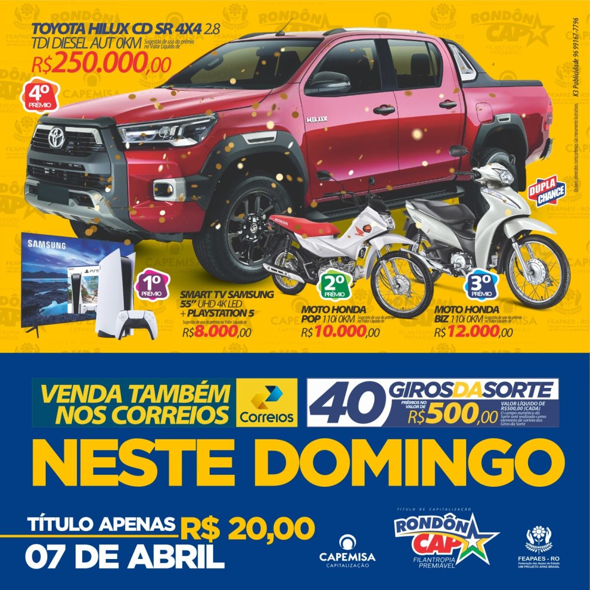 E mais: uma Honda Biz, uma Honda POP, uma TV GIGANTE mais playstation 5 e 40 giros da sorte. São 300 mil reais em Prêmios e o Título DUPLA CHANCE - é sorte em DOBRO para você! RondonCap Especial de abril, quem sonha e acredita - realiza; transforme o seu sonho em Ação.