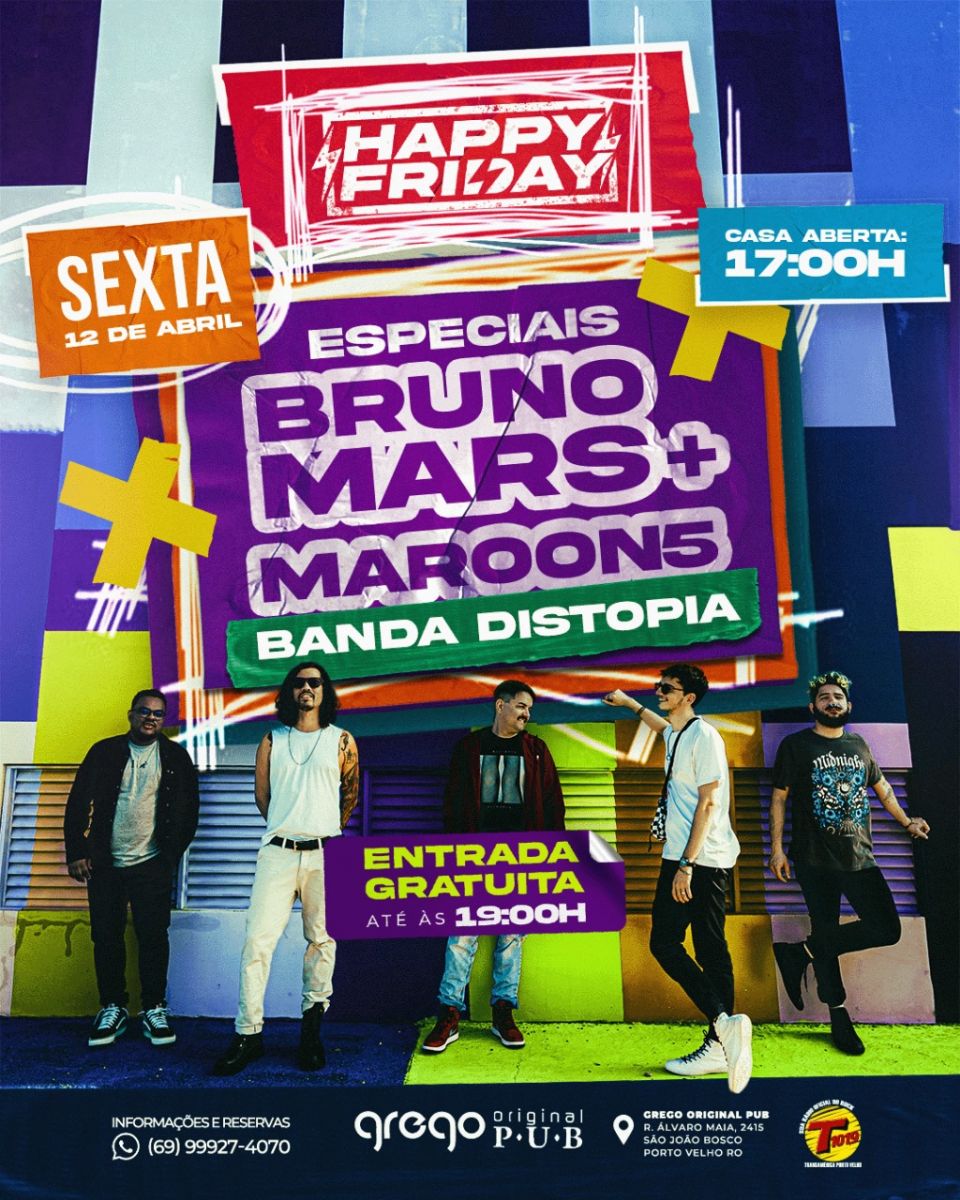 Sexta feira, aberta a partir de 17h com muito happy hour! Chopp a partir de $6,99 e petiscos com 50% off. De atrações musicais, banda Distopia realizará o especial Bruno Mars e Maroon5. De abertura da casa, banda Vibe.
