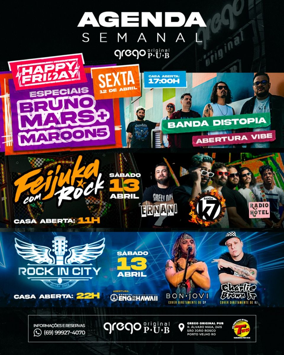 Os sábados são mais divertidos por aqui! Se você gosta curtir uma tarde agitada, com boa música e uma gastronomia diferenciada, precisa conhecer a feijuka com rock do grego original. Nesse sábado, o comando do show fica por conta das bandas K7, Rádio Hotel e Ernani Neto.