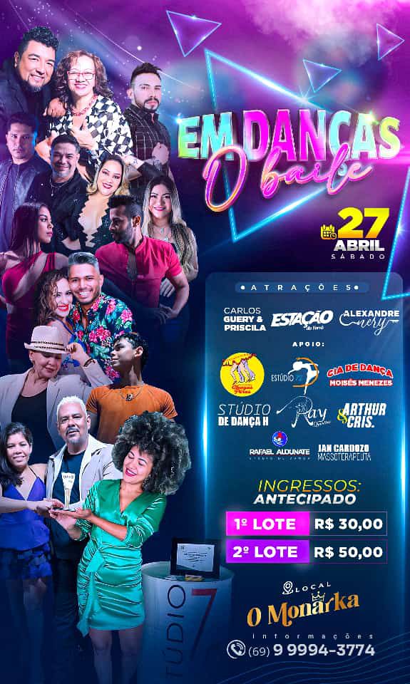 O evento 'Em Danças, O Baile', organizado pelo conceituado professor, coreógrafo e bailarino Chagas Peres, ocorrerá neste sábado, a partir das 22h, onde terá diversos ritmos musicais para dançar a dois, com participações de diversas academias de danças, apresentação de Dj's e show com a Estação do Forró, Carlos Guery, Geanne Priscila e Alexandre Nery.