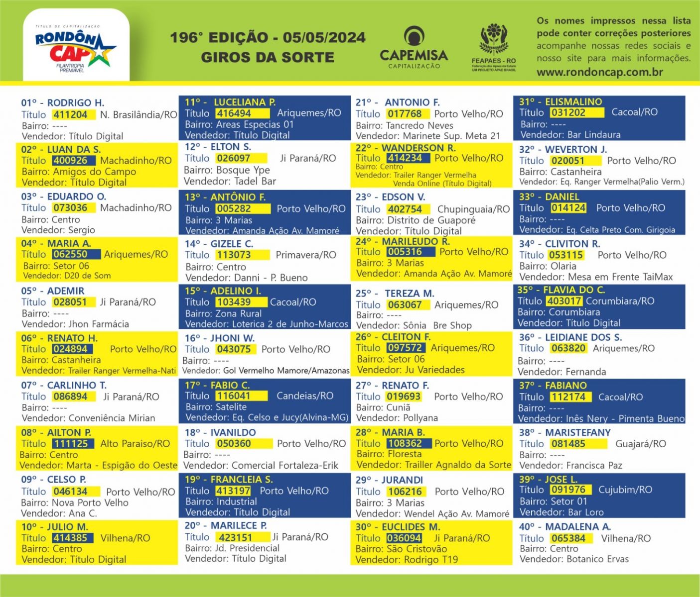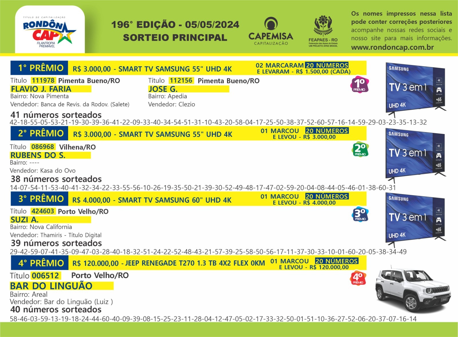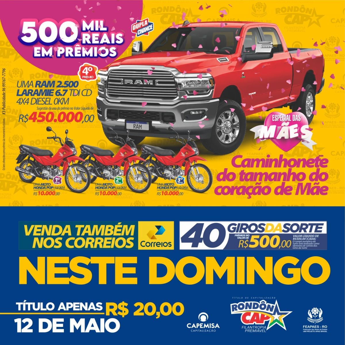 Neste Domingo o Rondon Cap Especial das Mães vai sortear uma DODGE RAM 0KM no valor liquido de 450 mil reais. Não é só uma caminhonete, é uma DODGE RAM, grande igual coração de mãe. E mais; três motos Honda POP e 40 giros de 500 reais. Rondon Cap Especial das mães - Meio milhão em prêmios! Compre o seu Titulo fisico ou Digital, ajude as APAES e deixe a sorte ajudar você, participe!