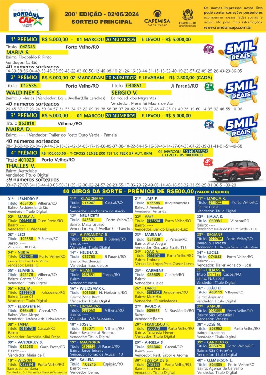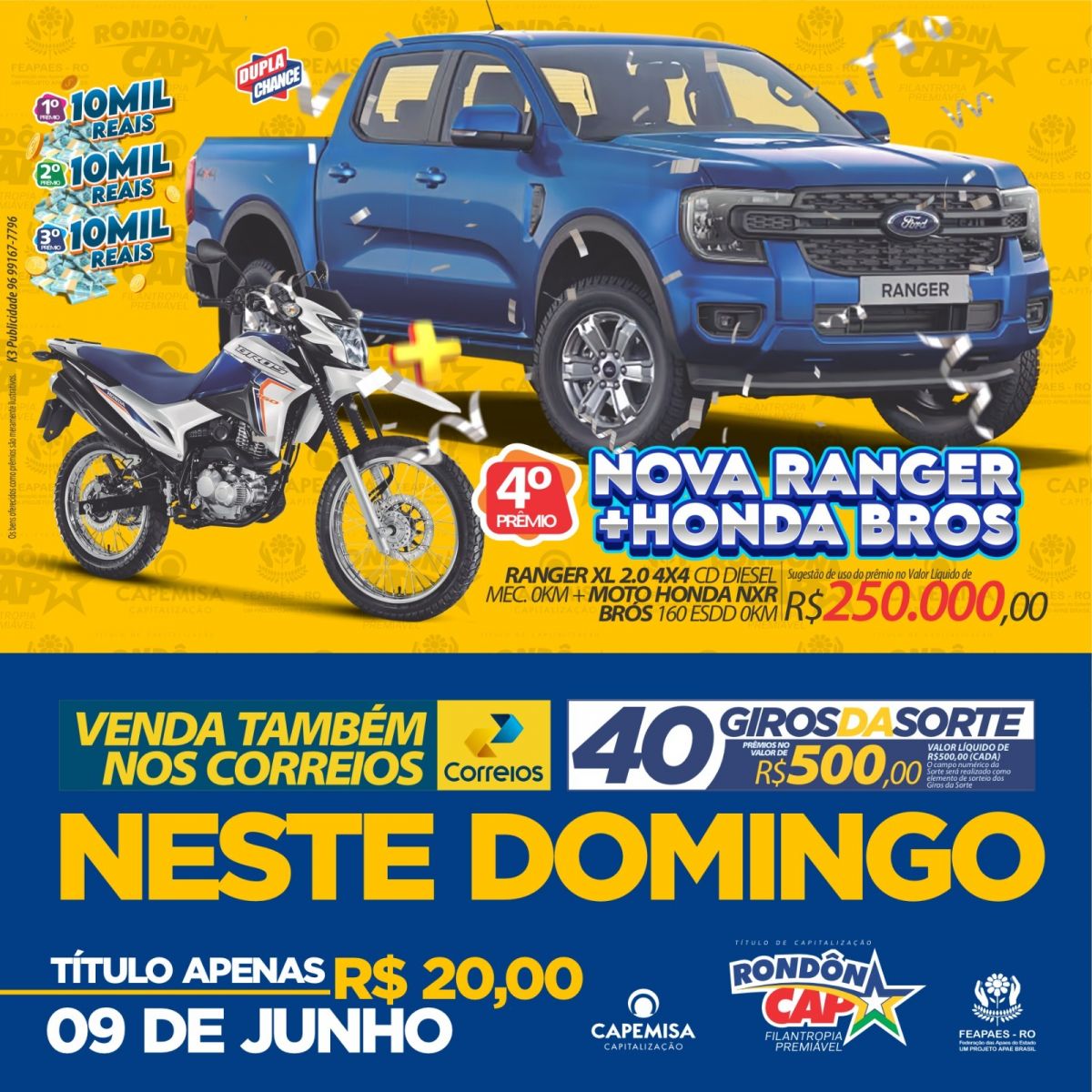 O RondonCAP Especial de junho traz uma Ford Ranger com uma Honda Brós na carroceria! É a nova Ranger e uma Bros juntinhas no valor liquido de 250 mil reais só no quarto prêmio. E ainda tem 10 mil reais no terceiro, segundo e primeiro prêmios e 40 Giros da Sorte de 500 reais cada.