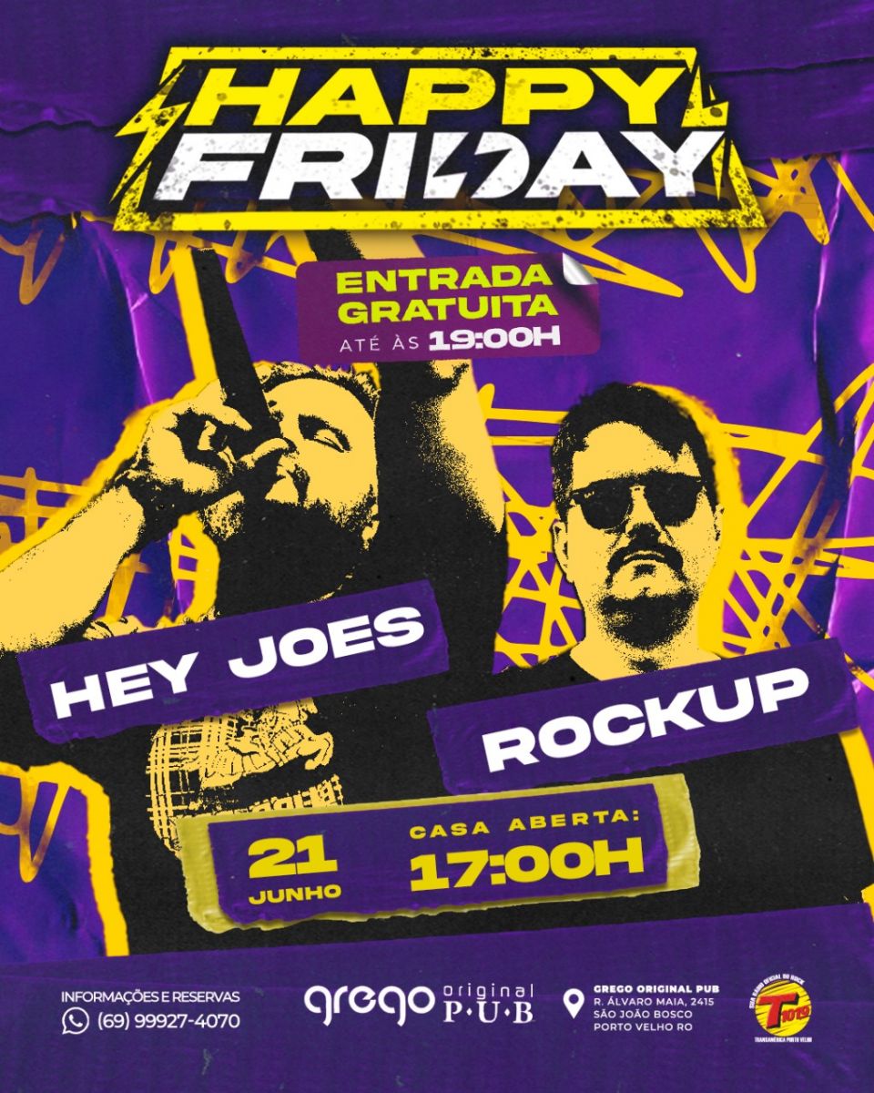 Toda sexta feira, happy hour no Grego Original. Chopp a partir de $6,99 das 17h as 22h. Petiscos 50% Off. Conduzindo o palco, shows de banda RockUp e banda Hey joe's.