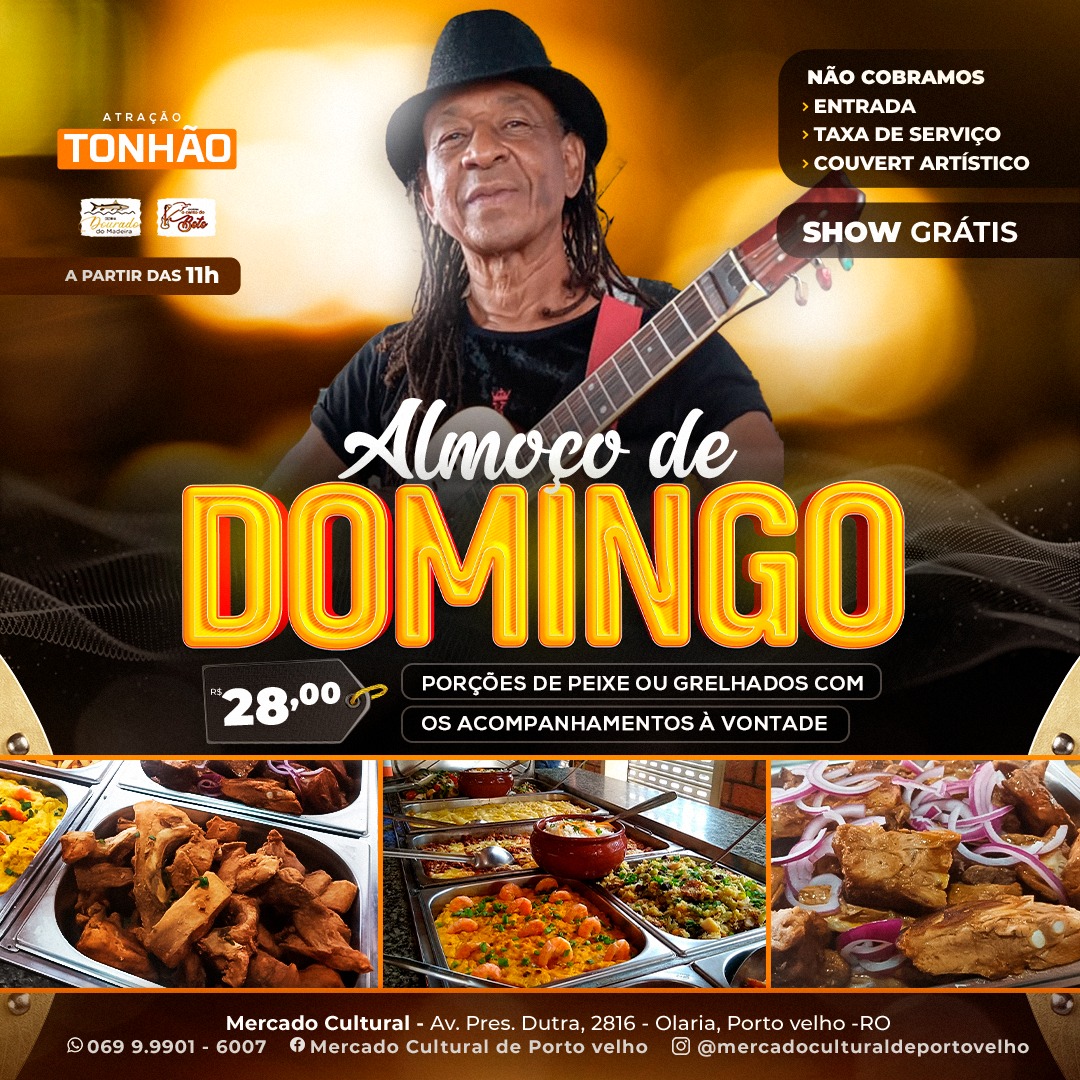 Já no almoço, onde a refeição custa apenas R$ 28.00 por pessoa, tendo no cardápio porções de grelhados, peixes, rabada, carneiro guisado, podendo ser mista, com os acompanhamentos (arroz, feijão, farofa, e saladas) a vontade, terá show do músico Tonhão e convidados.