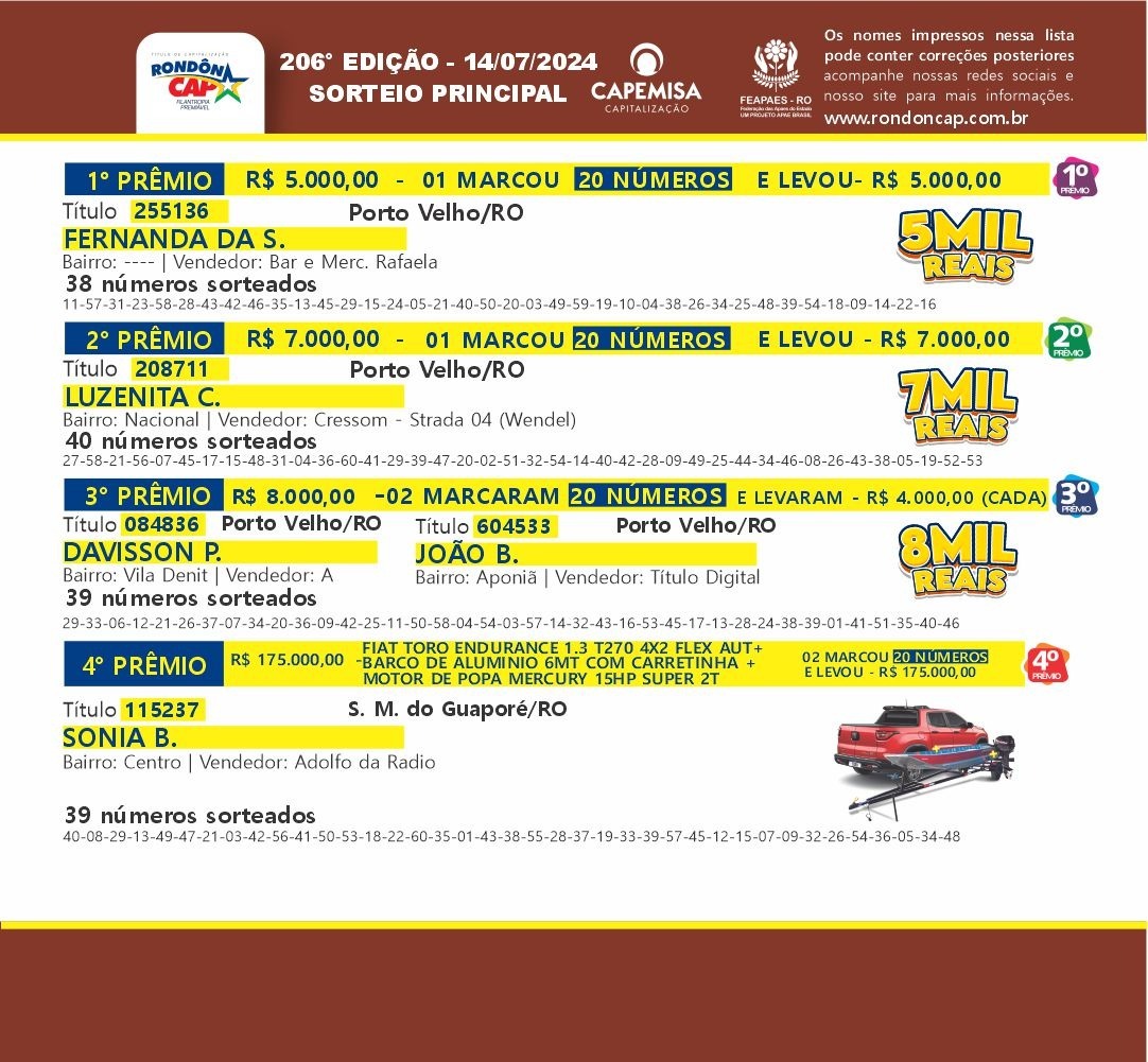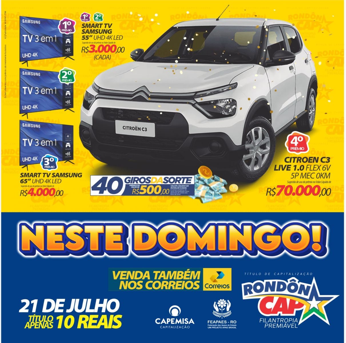 Neste mês de férias muitas pessoas já ajudaram as APAES e ganharam no Rondôncap! E neste domingo você poderá ganhar o novo Citroën C3 no valor de 70 mil reais. É carro zero com cheirinho de novo na garagem ou um Pix de 70 mil, e o Título só 10 reais. E mais... 3 super TVs e 40 prêmios de 500 reais.