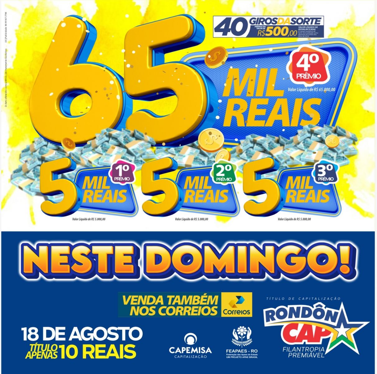 Quando você ajuda as Apaes a sorte pode ajudar você! Só em 2024 já foram mais de 1.500 ganhadores no RondônCAP, e no próximo domingo tem 65 mil no 4º prêmio; e ainda tem mais três prêmios de 5 mil e 40 Giros da Sorte de 500 reais. Serão 100 mil em prêmios; e o Titulo só 10 reais. É dinheiro direto na sua conta para você fazer o que quiser!