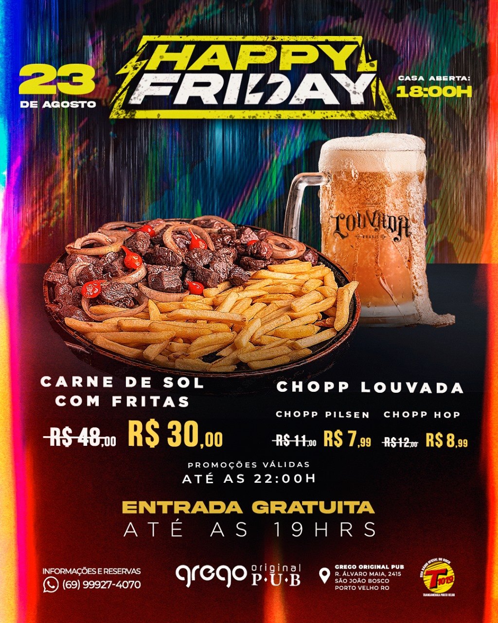 Chopp por apenas $7,99 só aqui! Happy Friday do grego original! Casa aberta a partir das 18h, com promoções até às 22h! Duas bandas fazem a festa até 02h da manhã! Nesta semana, banda Voyage e Banda Boulevard garantem que seu sextou seja um luxo!