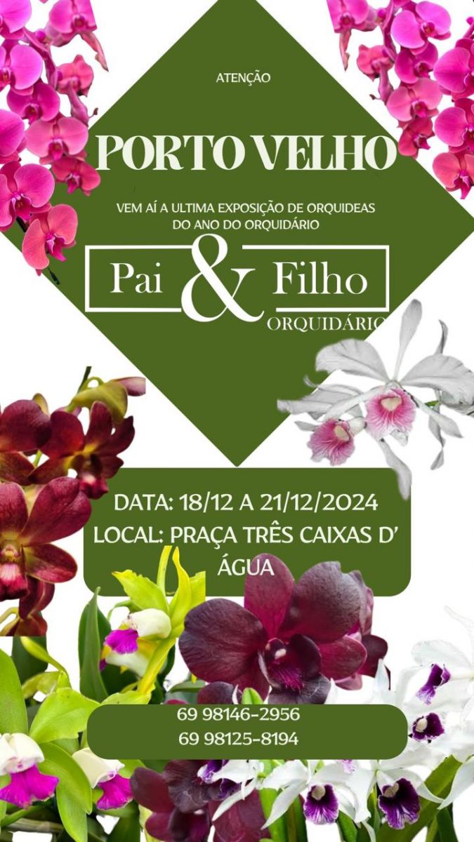 Vem aí a última Exposição do ano do Orquidário Pai e Filho a partir de quarta-feira(18) e se estenderá até o sábado (21).na Praça Três Caixas d’Água, Centro de Porto Velho (RO). O festival de Orquídeas é realizado pelo Orquidário Pai e Filho, de Ariquemes e durante o evento o Orquidário vai apresentar novidades do mundo florido.