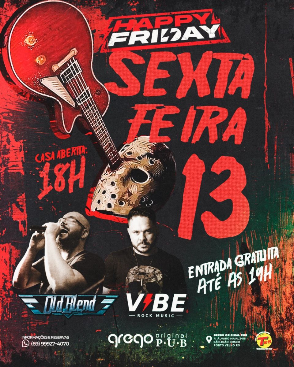 Chopp por apenas $7,99 só aqui! Happy Friday do grego original! Casa aberta a partir das 18h, com promoções até às 22h! Duas bandas fazem a festa até 02h da manhã! Nesta semana, banda vibe e banda Old blend garantem as boas energias do rock and roll em plena sexta feira 13!