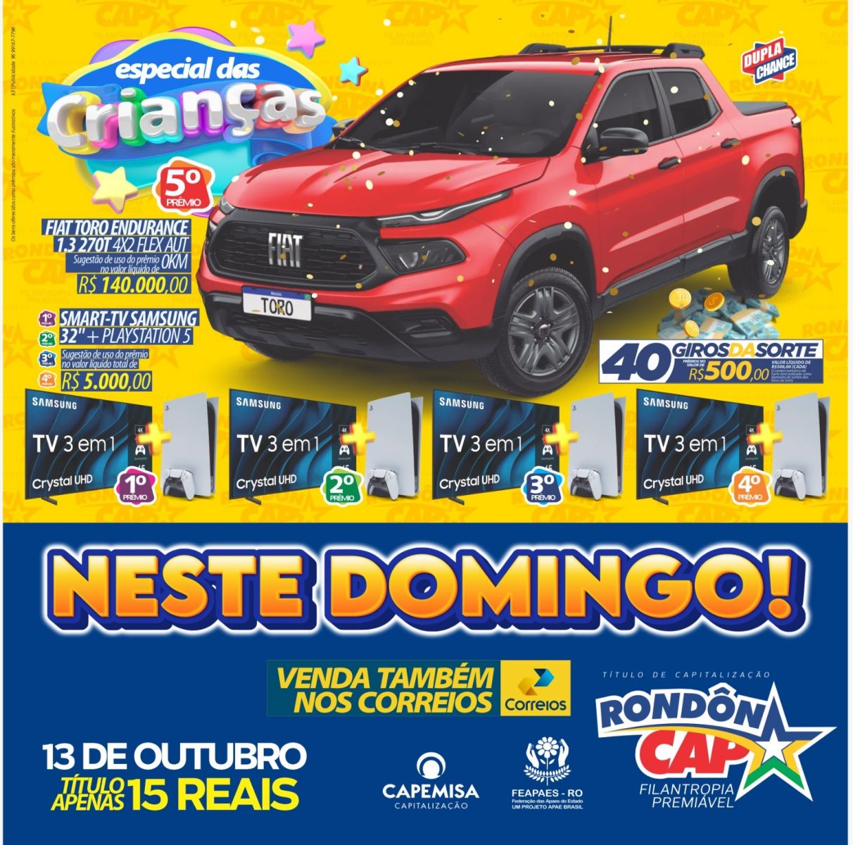 É prêmio para a família toda! São 04 TV’s mais Playstation 5 e uma FIAT TORO no valor de 140 mil reais no 5º Prêmio. É lazer e diversão para a criançada e brinquedo de gente grande para os adultos - é uma picape Toro! E ainda tem 40 Giros da Sorte de 500 reais. RondonCAP Especial das Crianças compre o seu Titulo Fisico ou digital e viva a alegria de compartilhar, sinta a emoção de ganhar - participe!!