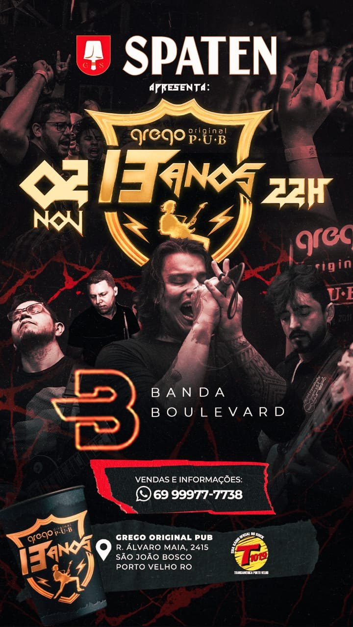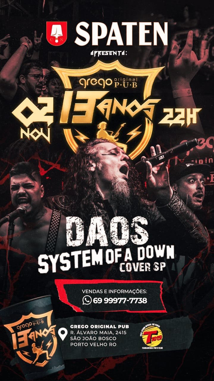 Vamos comemorar 13 anos de casa em grandíssimo estilo: banda Boulevard abrindo a noite, banda Old Blend fazendo especial Iron Maiden e diretamente de São Paulo, banda DAOS system of a down cover!!! A casa abre 22h, é festa para amanhecer o dia.