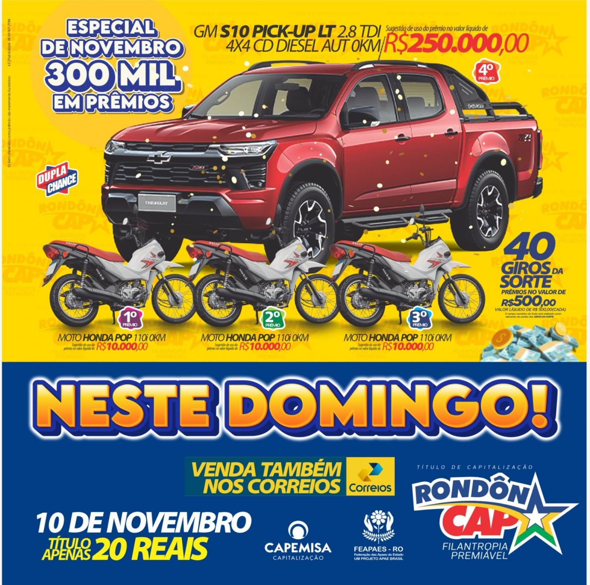 É uma máquina, é uma caminhonete e ela pode ser sua - ou você pode levar um PIX de 250 mil. E tem mais; são três Motos Honda POP e 40 Giros da Sorte de 500 reais. Sâo 300 mil em prêmios e o Titulo Dupla Chance de ganhar. Compre o seu RondonCAP fisico ou Digital com o vendedor de sua preferencia ou no ponto de vendas mais perto de você; ajude as APAES e participe!