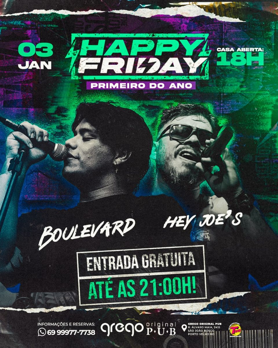 Fazendo o primeiro happy hour do ano banda Hey joes e banda Boulevard. Aproveite chegue até às 21h e não pague entrada!