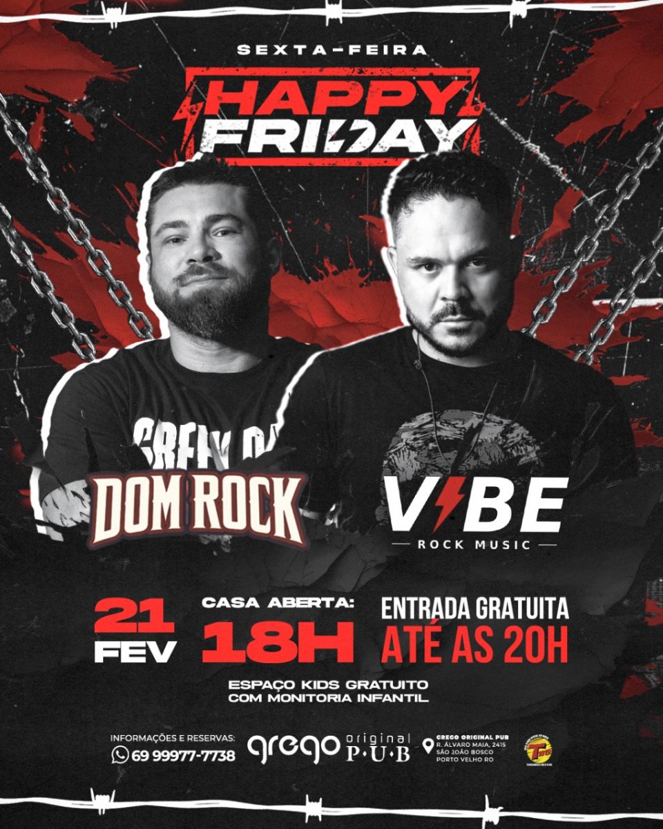 De atrações músicas, essa sexta feira conta com banda Vibe e banda Dom Rock. Chegue até às 20h e não pague sua entrada.