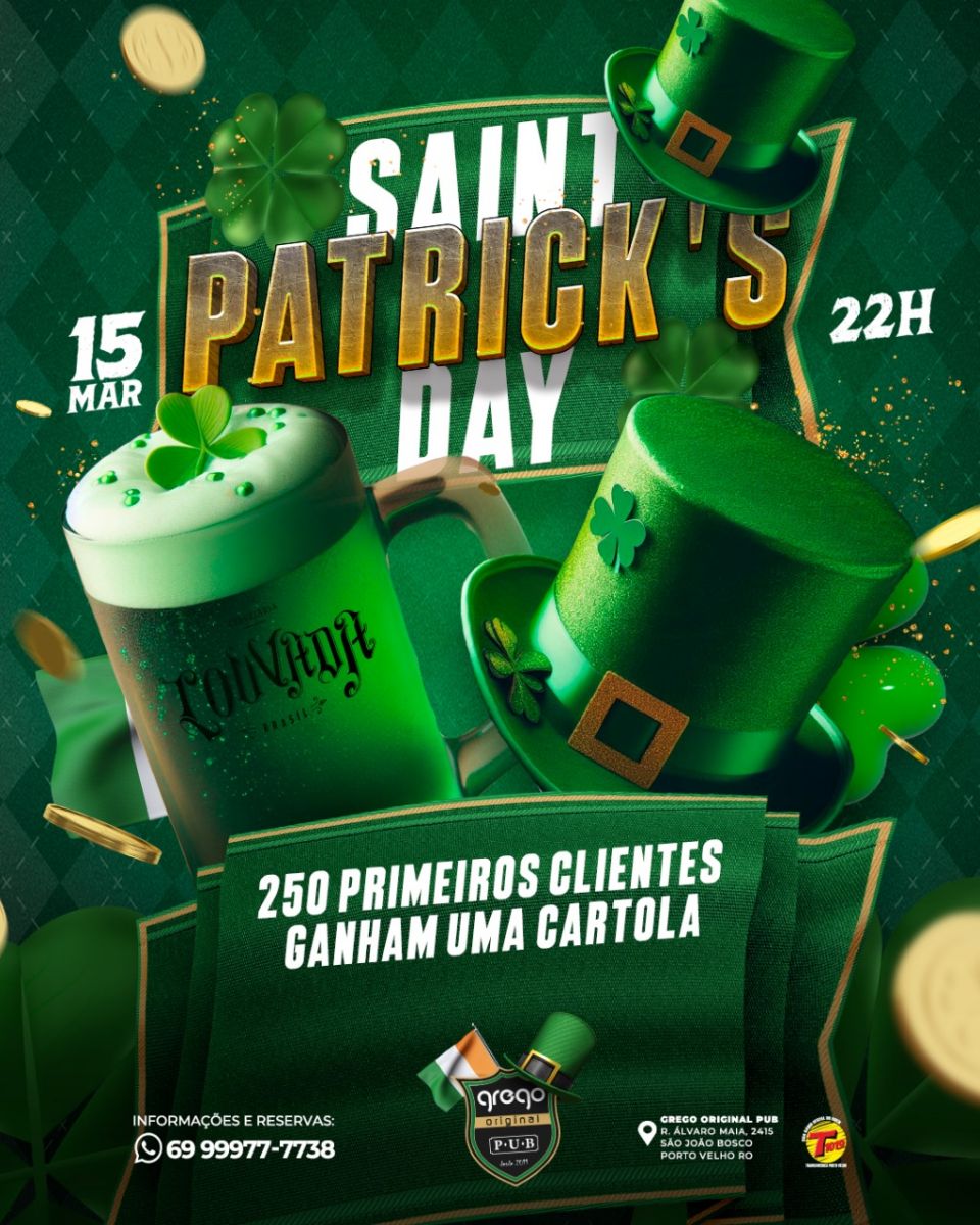 O dia mundial para tomar uma cerveja chegou! Sábado, a partir das 22h, casa em clima de saint patricks Day! Teremos banda Boulevard com especial Pearl jam e banda Old Blend com AC DC e clássicos do rock! Vai rolar muito chopp verde, todas as cervejas estarão em promoção e as adoráveis cartolas de são patrício estarão sendo distribuídas! Bora? Adquira seu ingresso 69 99977-7738