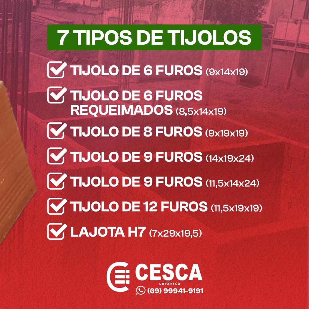 Na Cerâmica Cesca, você encontra o tijolo perfeito, seja para pequenas reformas ou grandes construções, temos as melhores opções para cada etapa do seu projeto. Nossos produtos tem a qualidade que constrói sonhos e o compromisso com a sua satisfação.