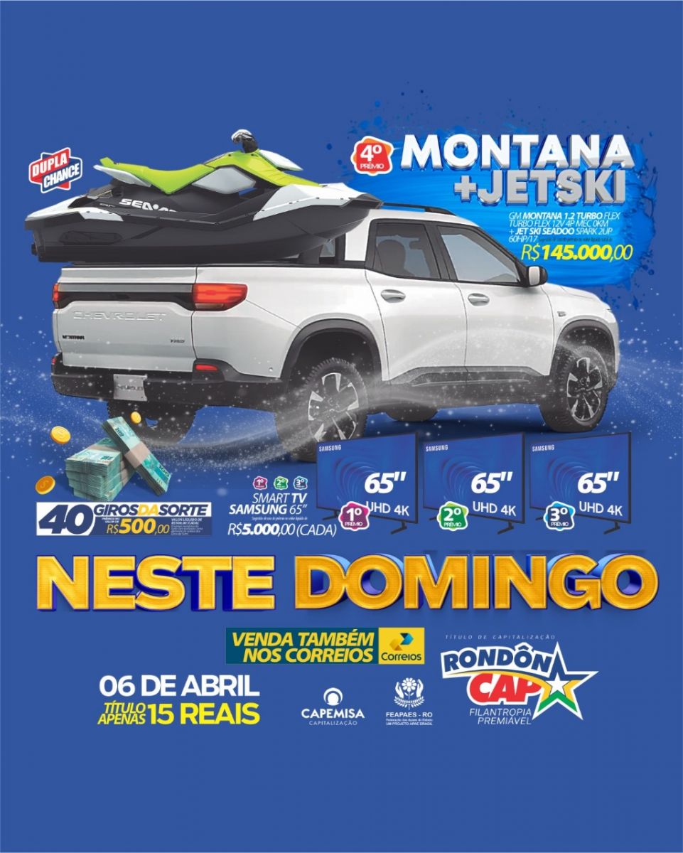 O RondonCAP deste domingo vai tirar você da rotina! No 4º prêmio tem uma PICAPE MONTANA e um JETSKI juntinhos no valor de 145 mil reais!